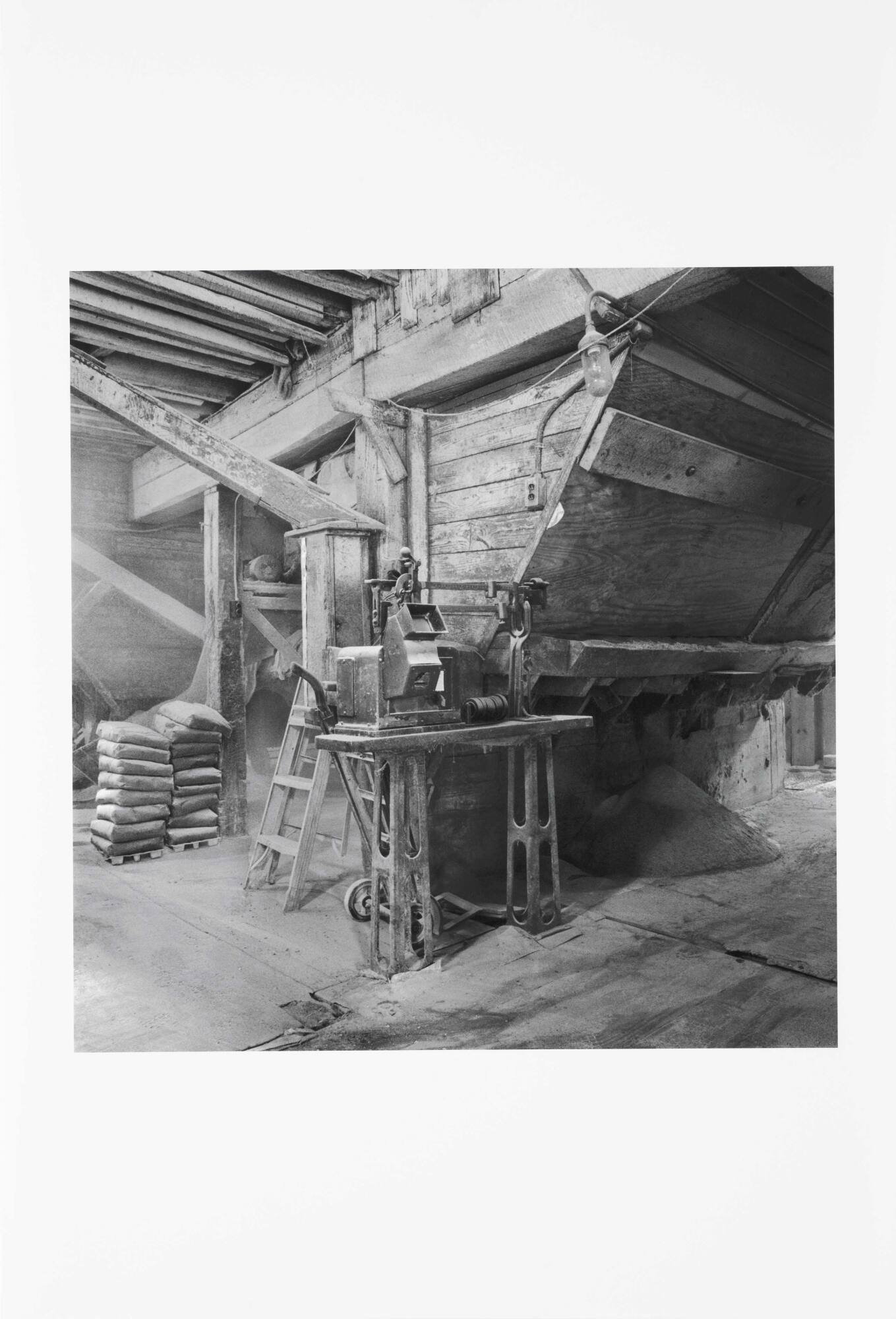 DescriptionInterior of feed mill with wood paneled walls and ceiling.Copyright© David Plowden