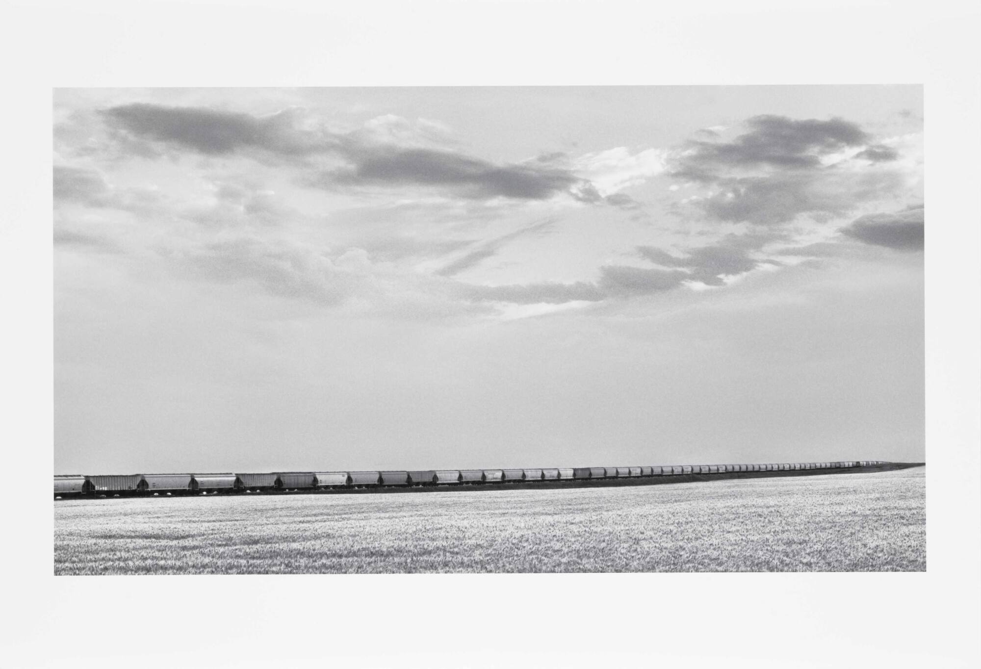 DescriptionImage of long train traveling through field with clouds stretched out above.Copyright© David Plowden