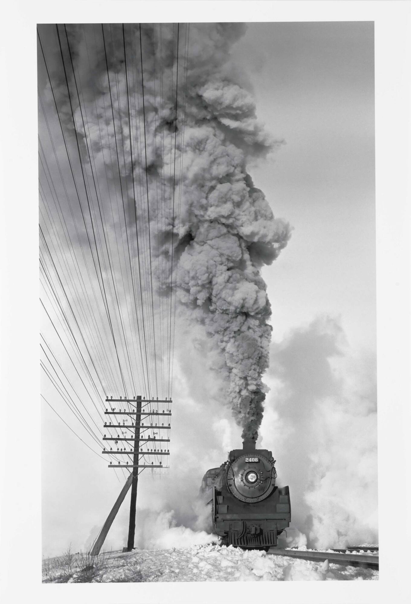 DescriptionImage of the front of locomotive #2408 with dark smoke billowing out of chimney and snow covering ground.