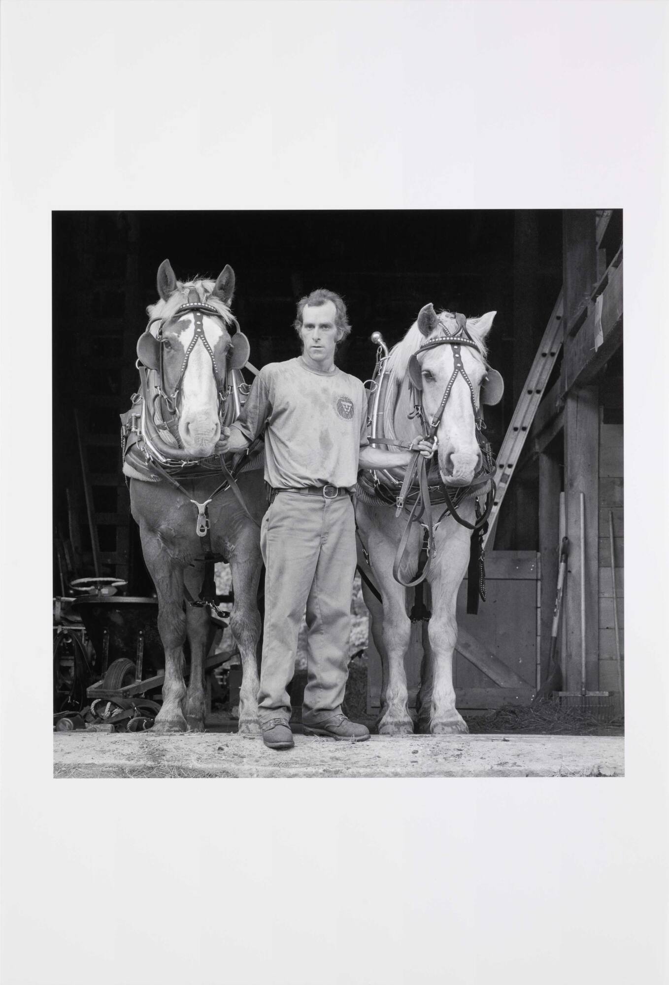 DescriptionImage of man standing between two horses while holding their bridles.Copyright© David Plowden