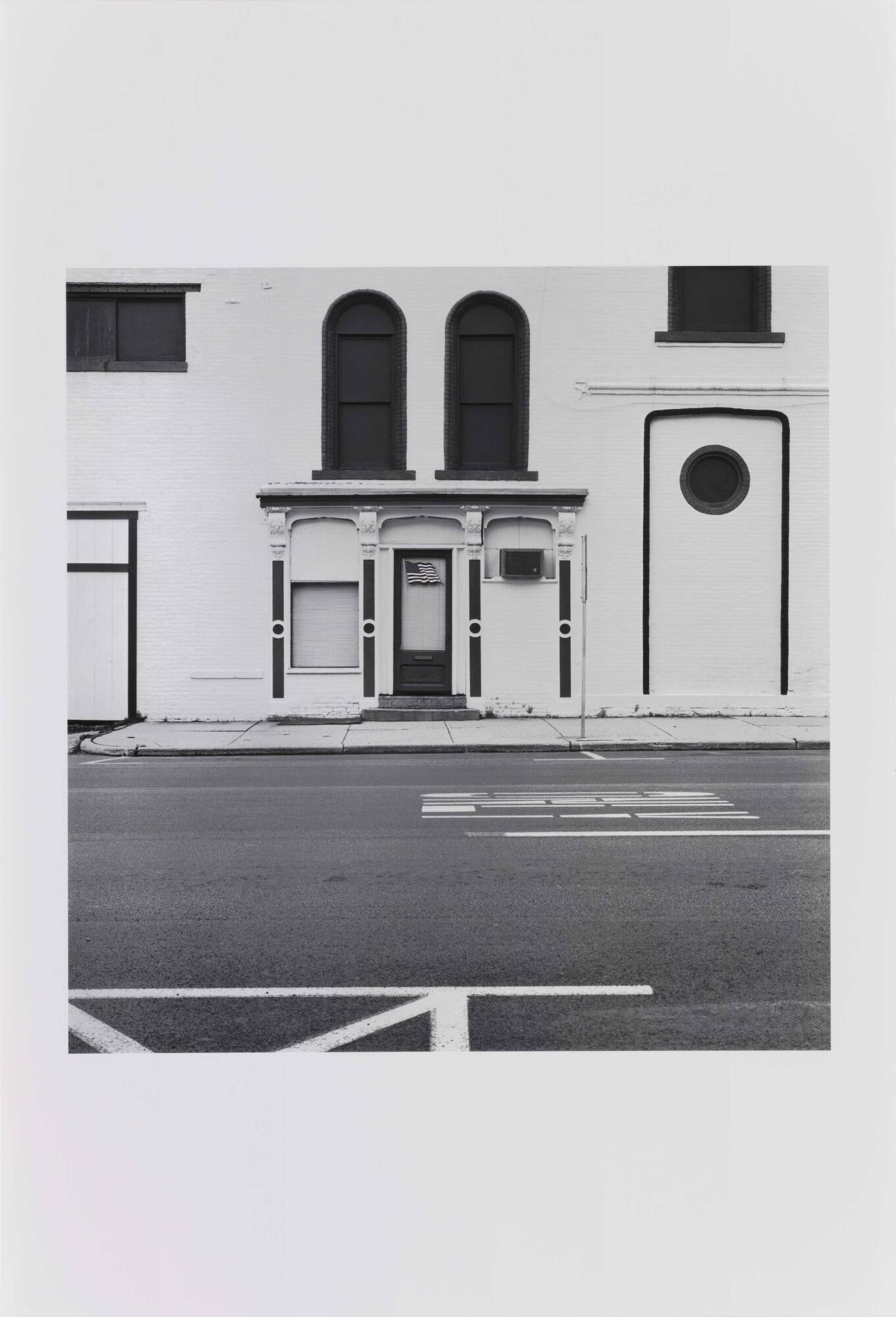DescriptionImage of a building with an air conditioning unit in the window and an American flag on the door.Copyright© David Plowden