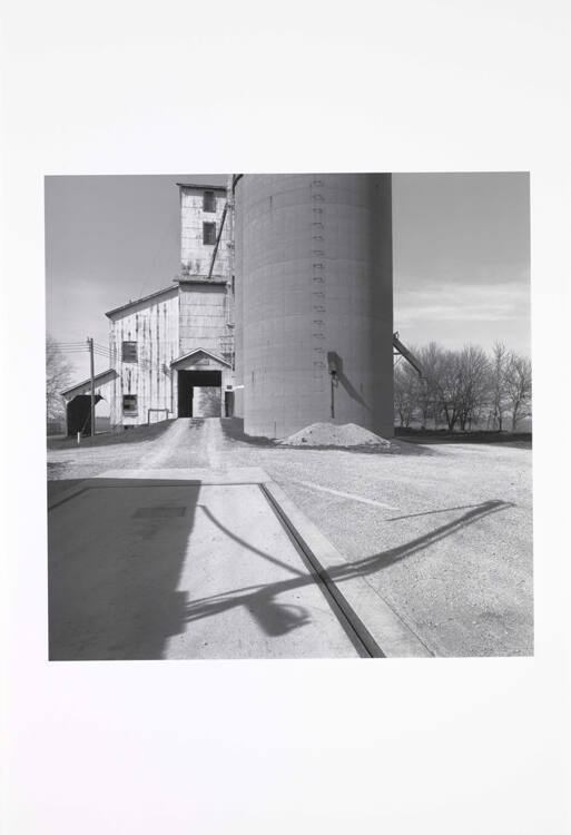 DescriptionImage of grain elevator and shadows on gravel in foreground.Copyright© David Plowden