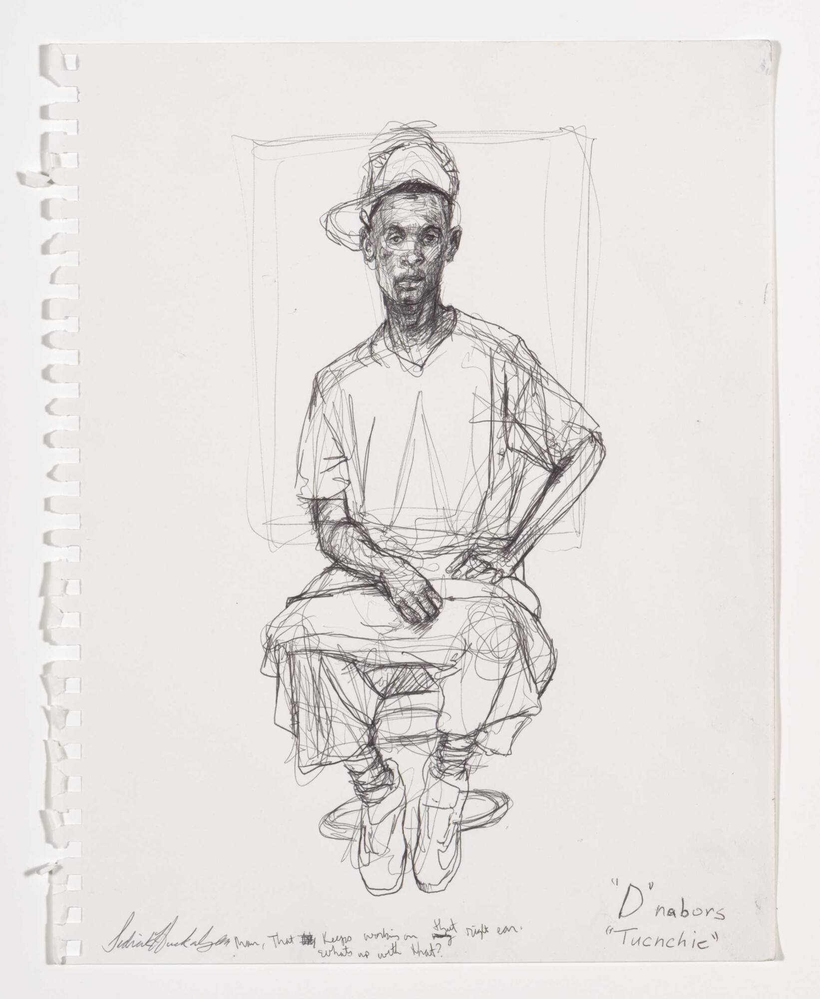 DescriptionThis black and white drawing depicts a seated African-American man wearing a baseball cap, a short sleeved shirt, pants and high-topped athletic shoes.Copyright© Sedrick Huckaby