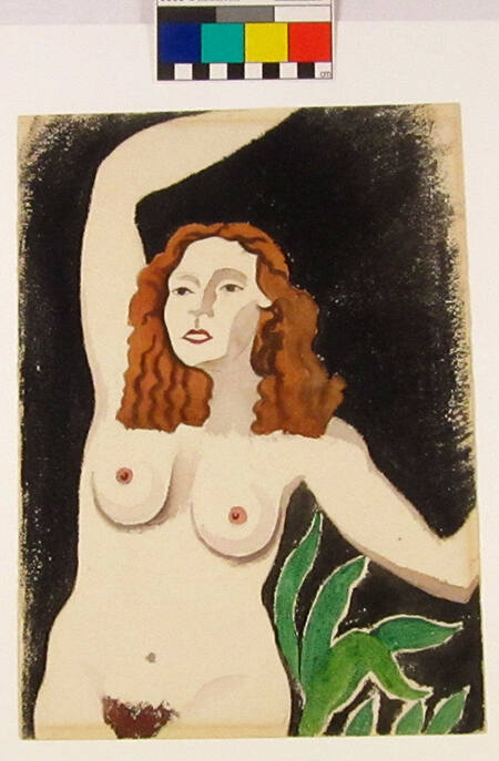 DescriptionThis watercolor represents the hip-length form of a red-headed nude woman outlined by a black background on off-white watercolor paper. The black background does not extend to the edges of the page in the upper left or right corners, or on the left or right sides of the page. The woman raises her bent right arm above her head and extends her bent left arm out to the side. The right arm extends beyond the paper just above her wrist, and the left arm just below her elbow. A green plant is positioned beneath her left arm, in the lower right corner. On the verso is a line drawing of an urban scene with intermittent blue, peach, and brown watercolor washes.