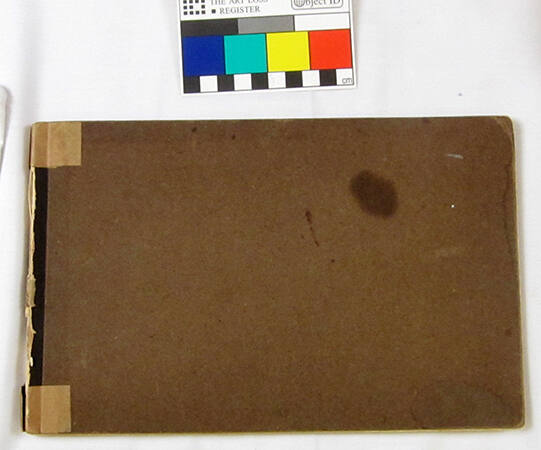 DescriptionThis sketchbook is bound with a brown paper cover and contains eight graphite drawings. In order they include a loose line drawing of trees in front of houses, with the foreground partially obscured by a tree trunk. This drawing is signed and dated in the lower left corner: “G. C. Ault ’24. / Paris.” The second drawing is a shaded abstract form that grows from the upper left corner of the page and extends down, touching the right of the page. This drawing is titled, initialed, and dated: “Clouds. / G. C. A. ’44.” The third page contains a small, angular church building precisely drawn against a quickly sketched hill with a grove of angular trees. It is signed and dated: “G. C. Ault ’41. / Church, Shady NY.” The fourth drawing is a contour line drawing of a cat with shaded body and background, centered on the page. This drawing is titled, initialed, and dated: “‘Dinky’ / G. C. A. ’41.” The fifth drawing is an abstract landscape with a landmass defined through a single contour line and shading, a clear sky immediately above the landmass, and at the top of the page an intermittently shaded sky. It is titled, initialed, and dated: “Clouds / G. C. A. – ’48.” The sixth, abstract sketch includes quickly rendered clouds with a bolt of lightning extending toward two lines crossing the lower third of the page. It is titled, initialed, and dated: “Clouds / G. C. A. ’43.” The seventh drawing is a curling mass of shading sweeping along the left of the page and into the unshaded middle region, above a lower portion defined by a contour line and additional heavy shading. This drawing is initialed and dated: “G. C. A. ’44.” The eighth drawing includes four linear, precisely drawn trees emerging from loosely drawn brush. The drawing is titled and dated: “‘Gothic Arch’ / Jan. ’46.”