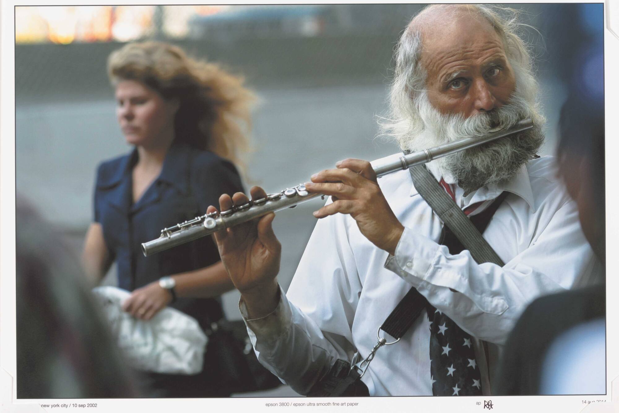 DescriptionImage of man with gray hair and beard, white shirt, and tie standing on the street playing the flute.ProvenanceDave Heath, Toronto, Ontario, Canada;