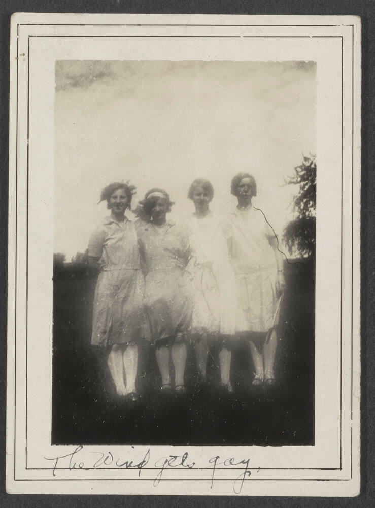 DescriptionImage of four women wearing dresses standing next to each other outside.