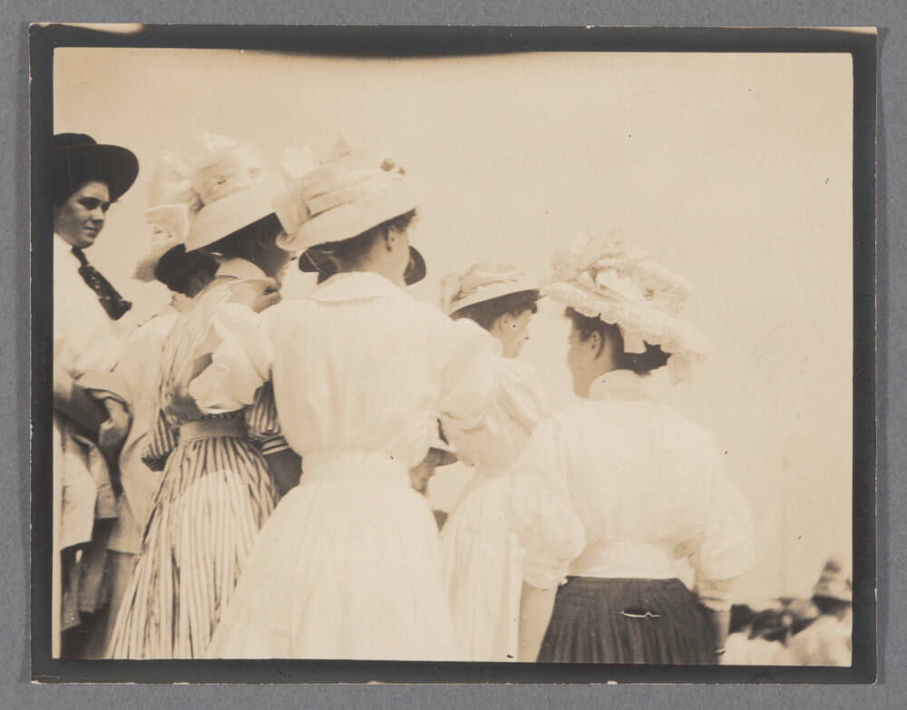 DescriptionImage of women seen from behind wearing dresses and fancy hats.