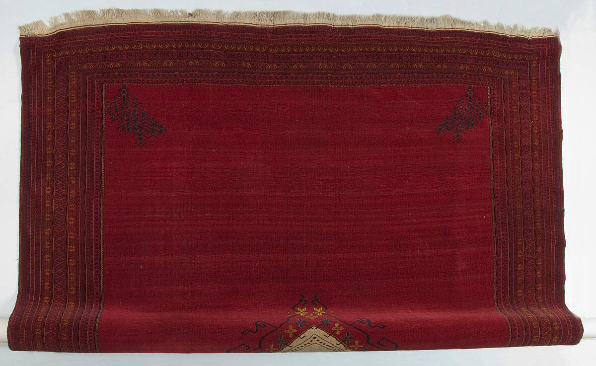 DescriptionOpen red field, center white diamond-shaped medallion, floral designs, nine borders, also solid and dotted line guard stripes. Colors red, orange, dark and light blue, white, brown.