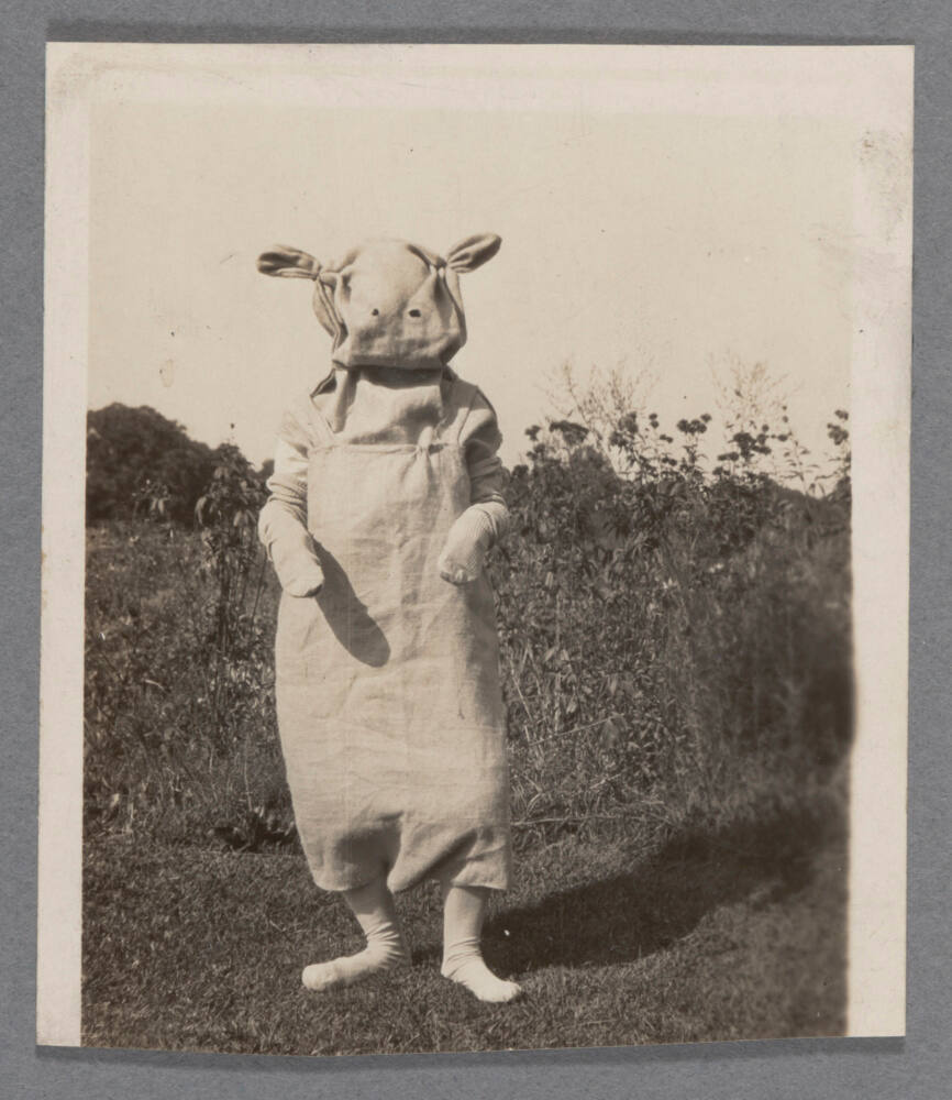 DescriptionImage of adult standing in yard and dressed in costume resembling a cow.
