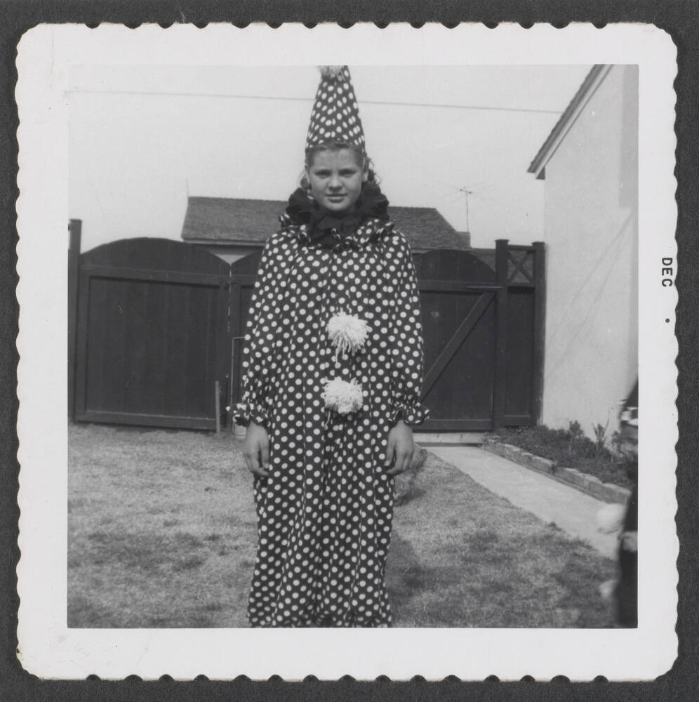DescriptionImage of girl dressed as clown standing outside home.