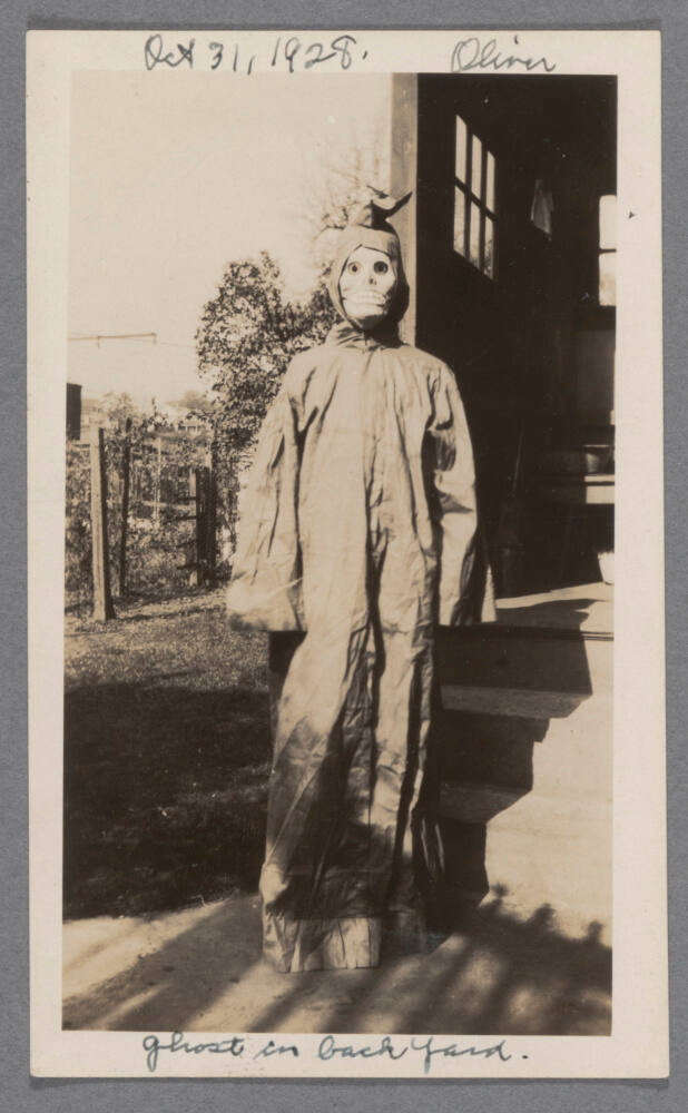 InscribedOn sheet recto, top center, in black pen: "Oct 31, 1928 Oliver"; On sheet recto, bottom center, in black pen: "ghost in back yard."; On sheet verso, left edge, in pencil: "Oliver / Oct 31, 1928"