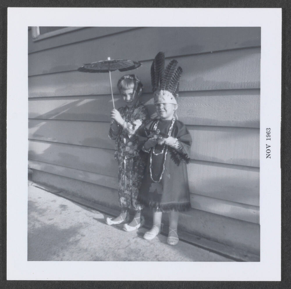 DescriptionImage of two children dressed in costumes posed against side of house.
