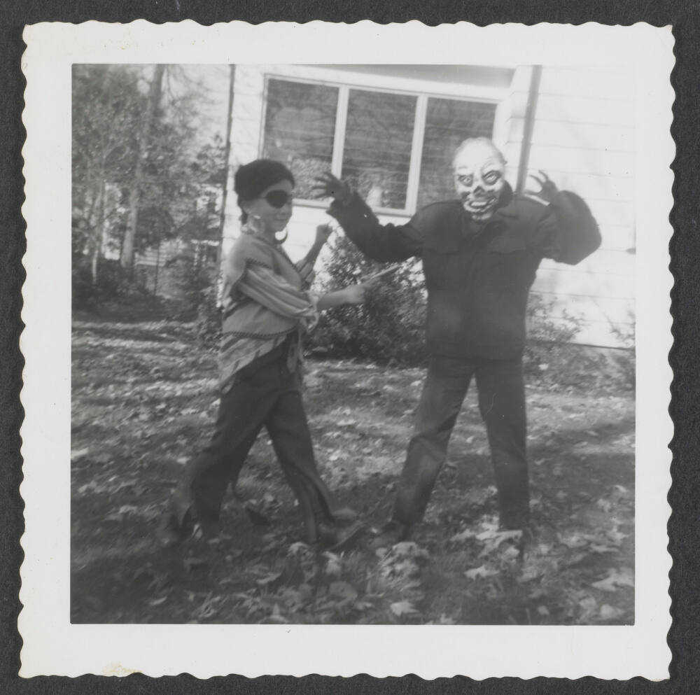 DescriptionImage of two children dressed in costume posed outside house.
