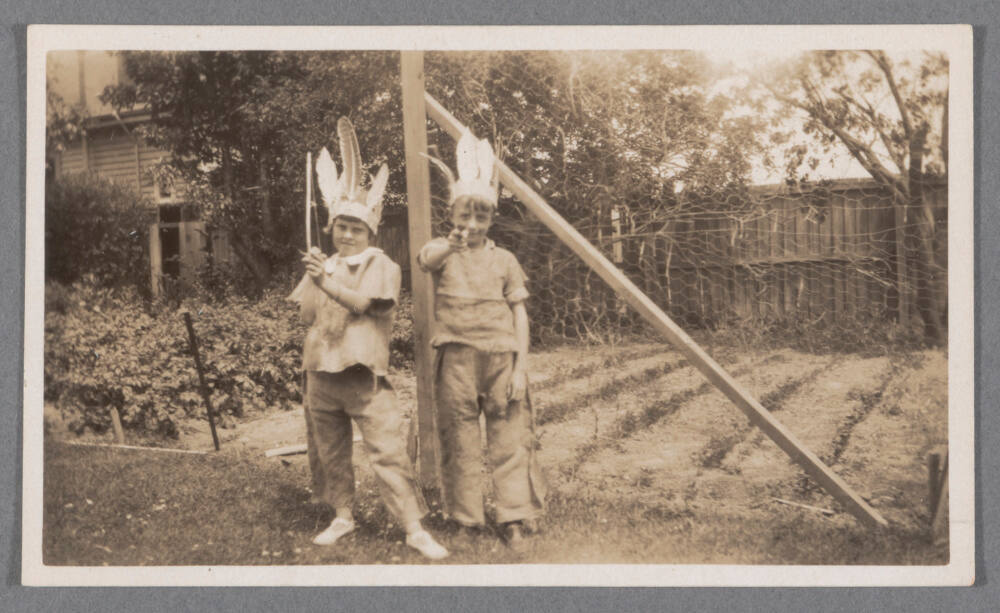 DescriptionImage of two children wearing feather headdresses standing near garden.