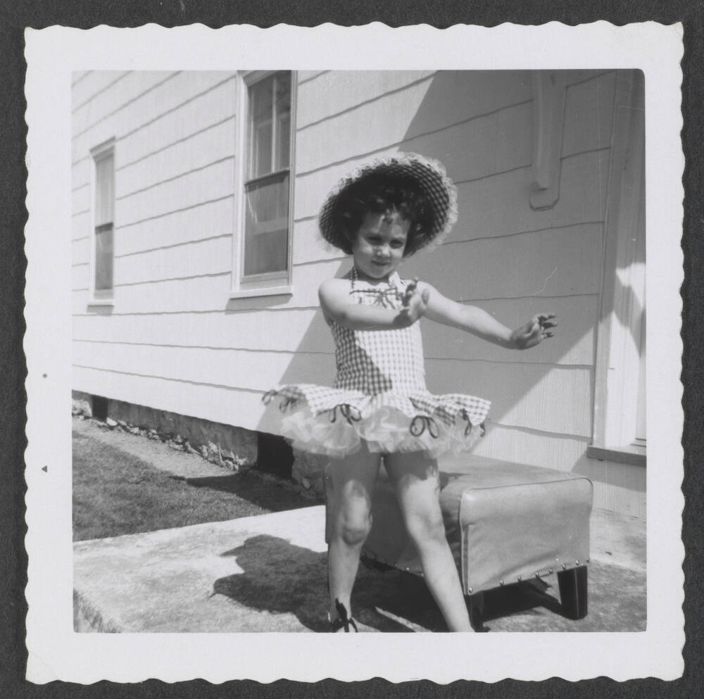InscribedOn sheet verso, center, in blue pen: "This is Deb's / dancing costume. / Green + White with / green sequins. / Cute Huh?"