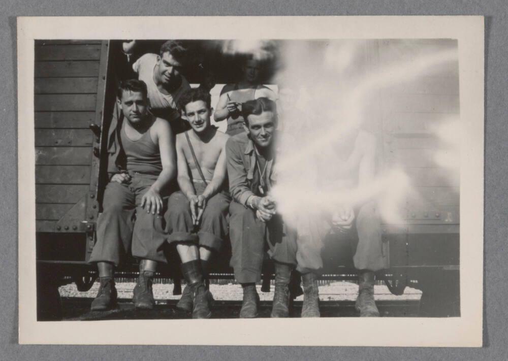 DescriptionImage of men seated in boxcar with right side of image partially obscured.