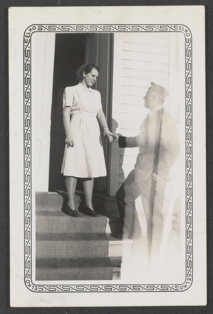 DescriptionImage of couple on stairs, man in uniform holding woman's hand.