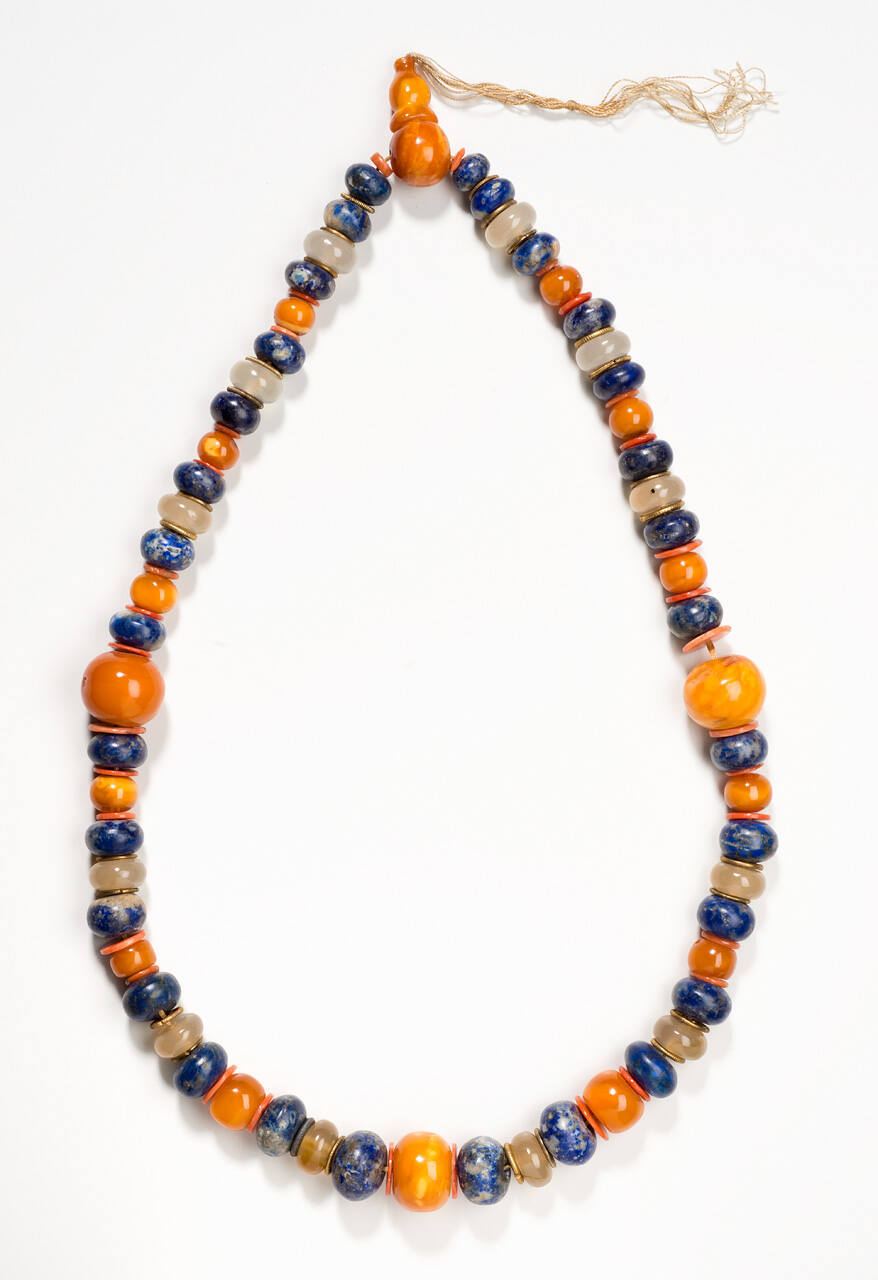 DescriptionRound beads slightly flattened, of light and dark amber and lapis. Four larger yellow beads. Tassel missing.