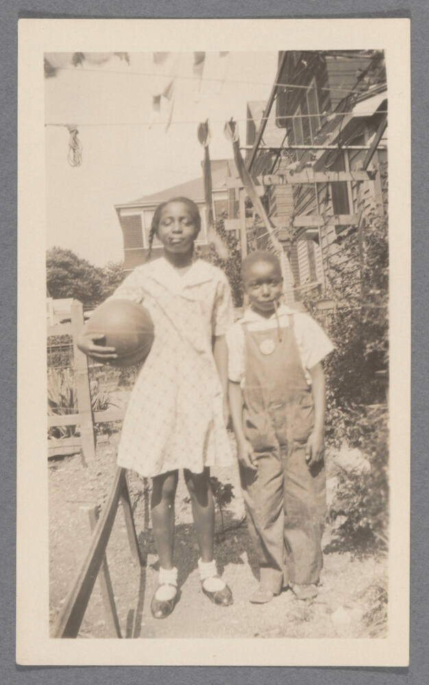 DescriptionImage of girl wearing dress holding basketball and standing next to smaller boy.