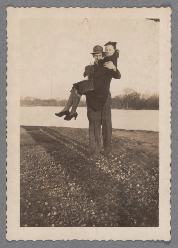 DescriptionImage of man in suit and hat smiling woman in his arms.