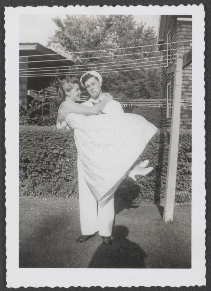 DescriptionImage of sailor holding woman wearing dress in his arms.