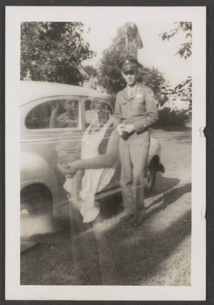 DescriptionDouble exposure of woman holding baby on hip with man in uniform standing by car.
