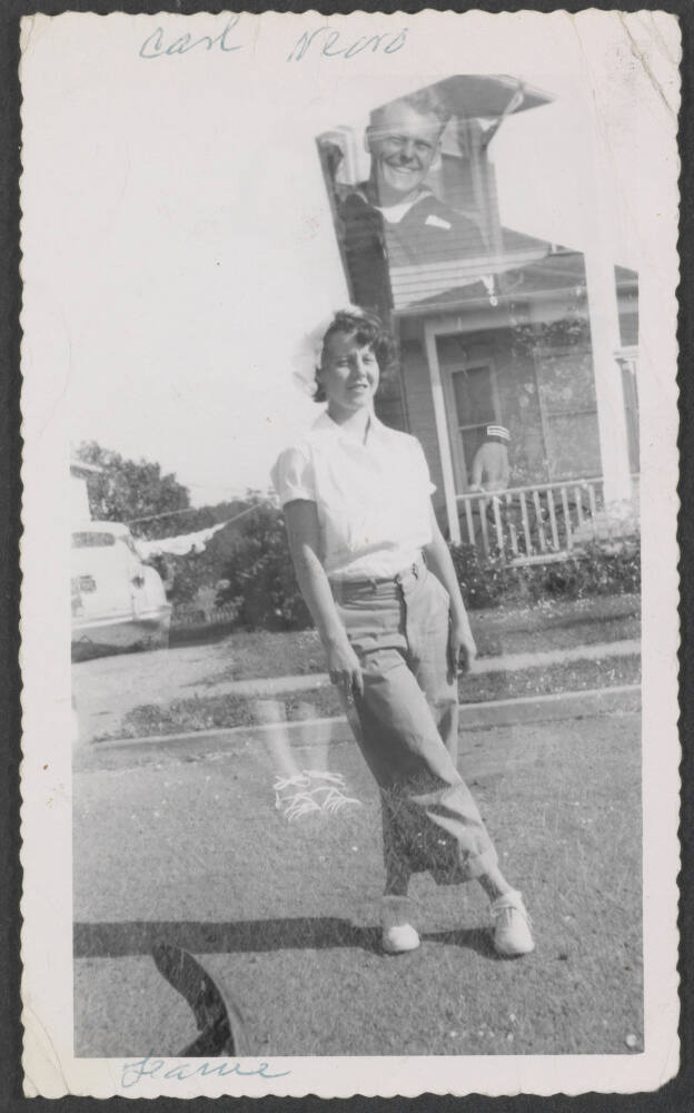 DescriptionDouble exposure of woman standing with legs crossed and man smiling.