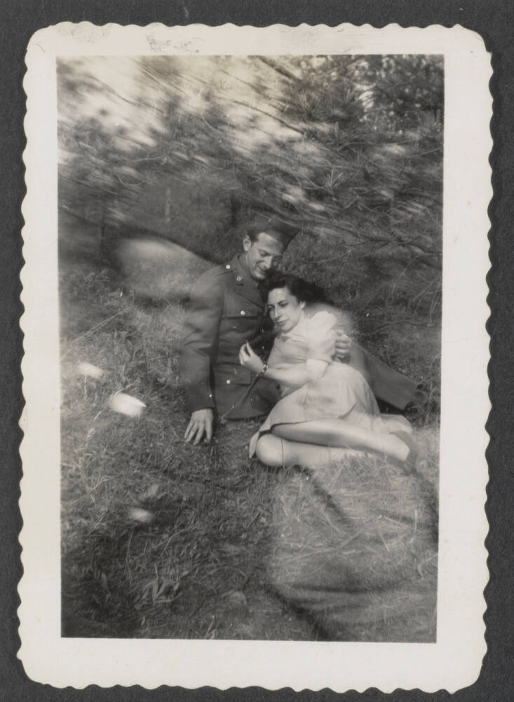 DescriptionDouble exposure of couple seated with blurry portrait of man.