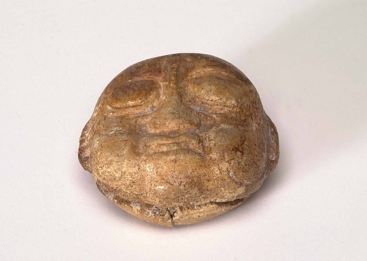 DescriptionFine yellowed bone head of an Olmec deity with a hollowed-out back, fat cheeks, closed eyes symbolizing death, suspension holes at the top, and with a drilled hole in the back, which could have been used to store a substance used by the shaman in a religious ritual.