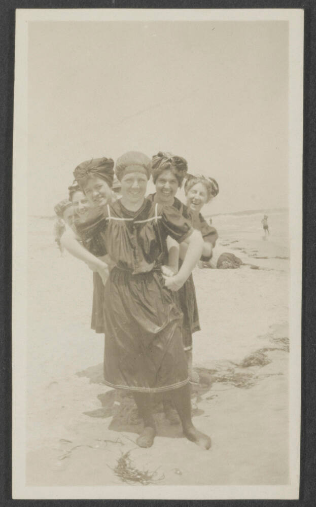 DescriptionImage of several women peaking out from behind another woman standing on the beach.
