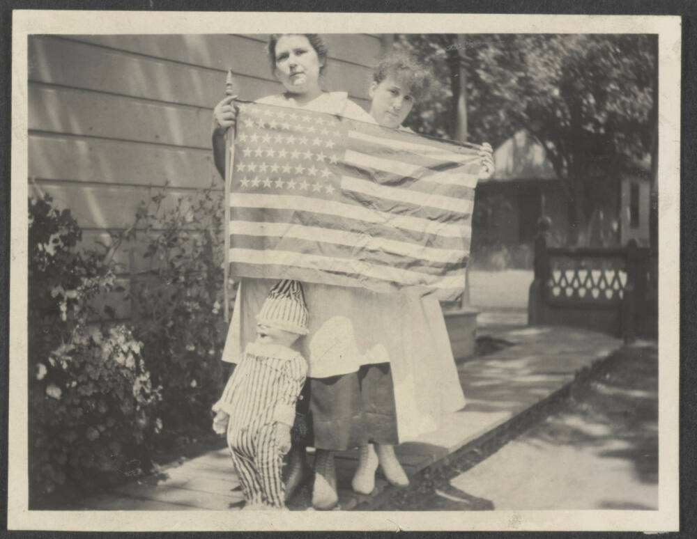 DescriptionImage of two women standing next to one another and holding flag with doll nearby. Partially torn portrait of woman on sheet verso.