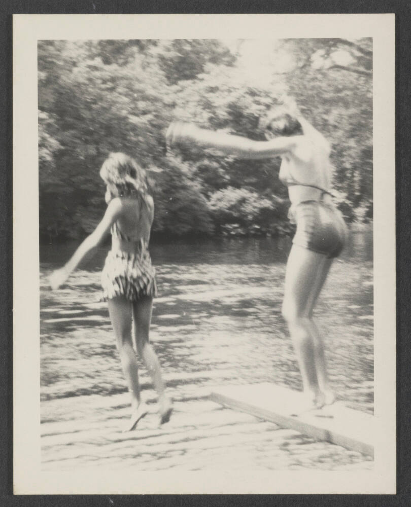 DescriptionImage of two girls jumping into lake.