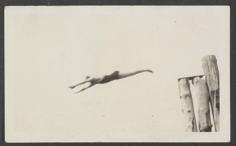DescriptionImage of blurry figure diving off wooden ledge.