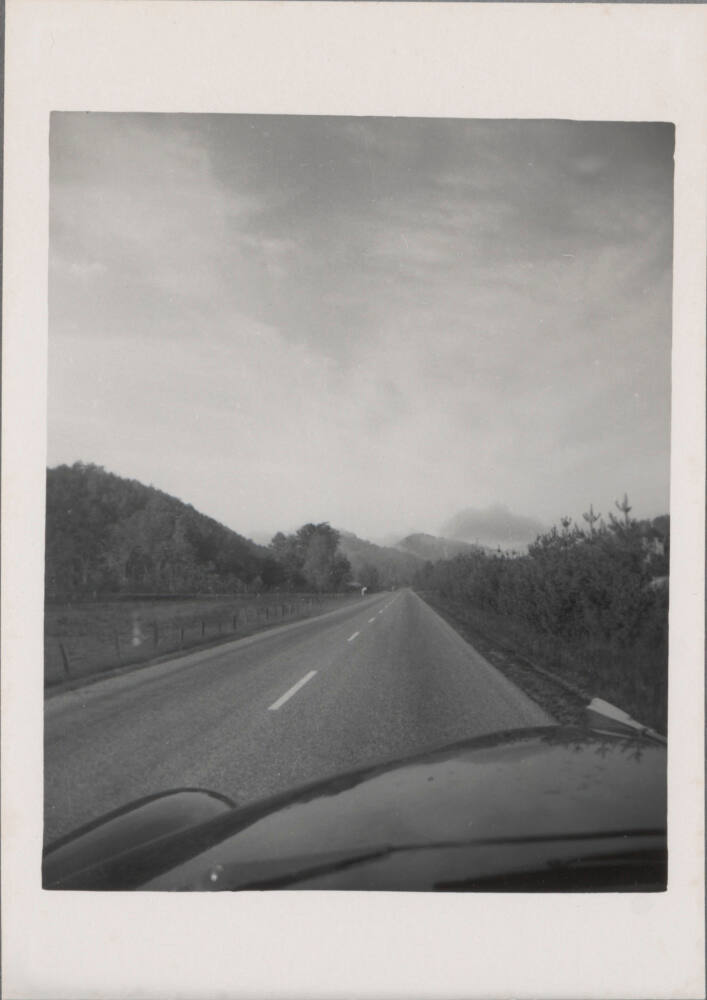DescriptionImage of road with mountains ahead as seen from inside car.