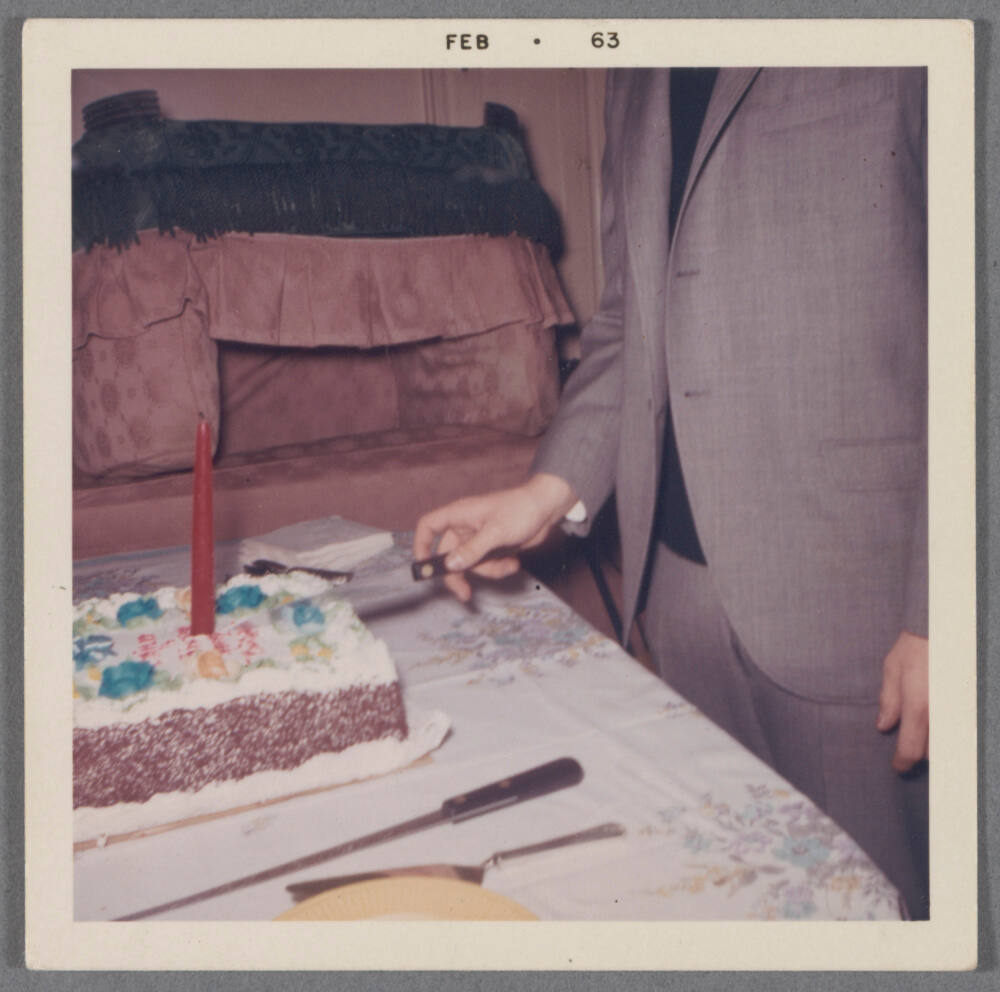 DescriptionImage of man wearing suit slicing cake with red candle.