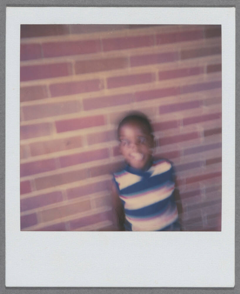 DescriptionImage of child standing against brick wall, blurry.