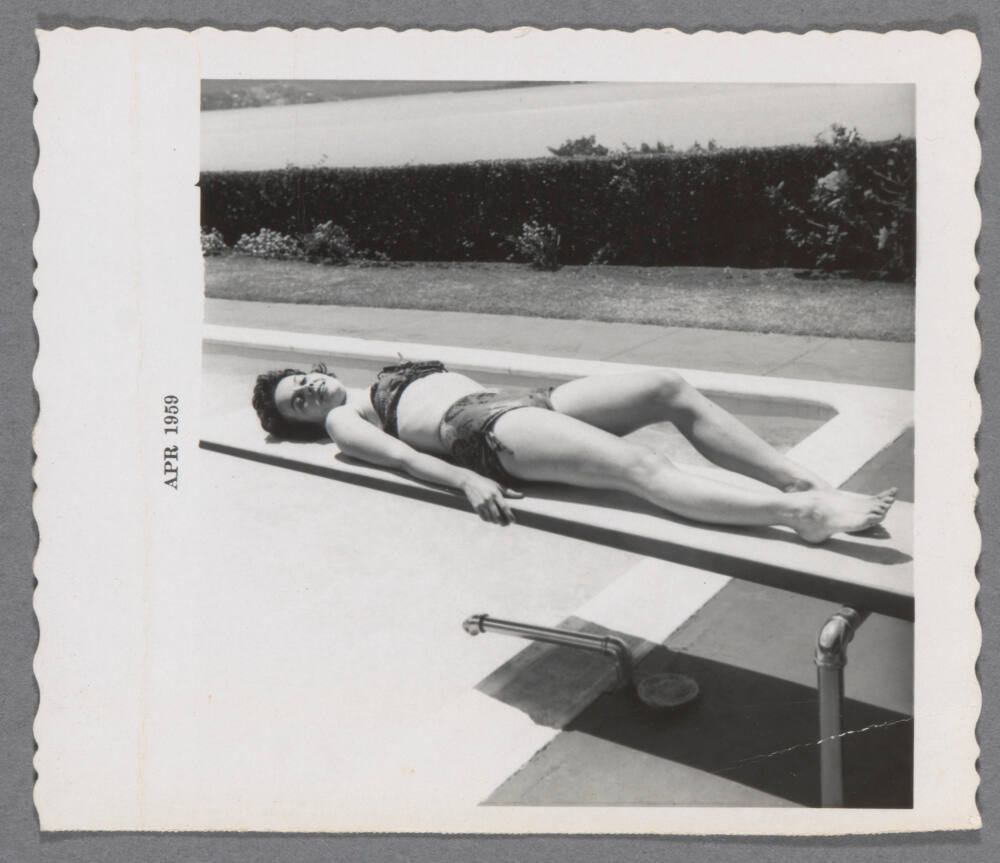 DescriptionImage of woman in bikini sunbathing on a diving board.