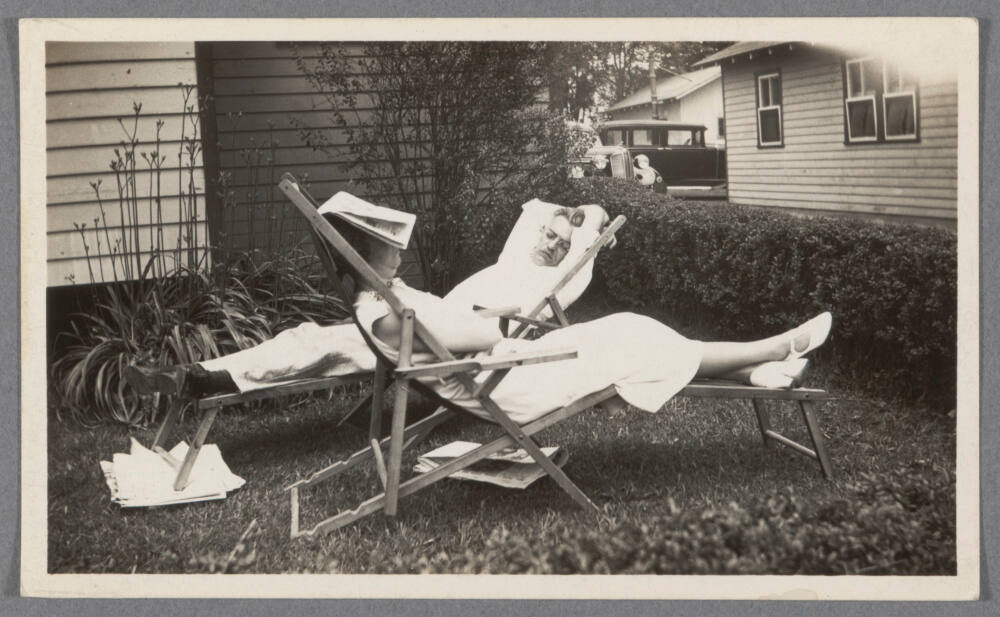 DescriptionImage of man and woman sleeping in lounge chairs in backyard; newspapers scattered nearby and covering woman's face.