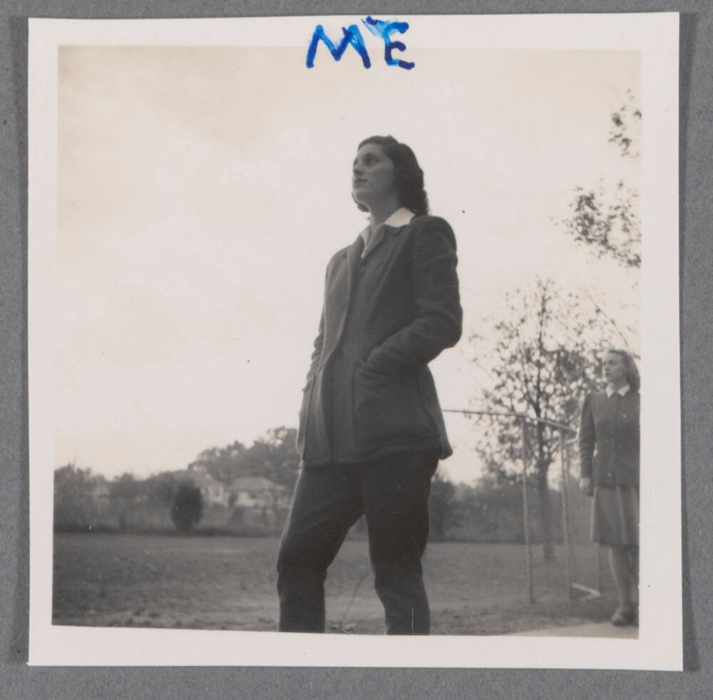 DescriptionImage of woman standing in profile with hands in coat pockets.