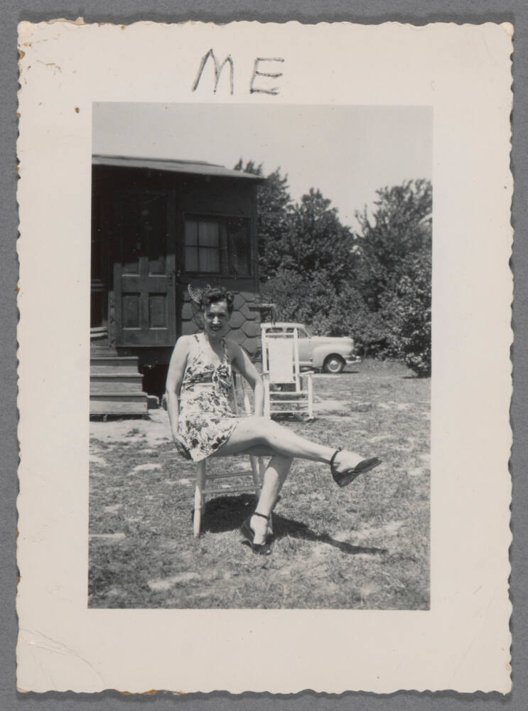 DescriptionImage of smiling woman wearing sundress and seated in chair with leg outstretched.