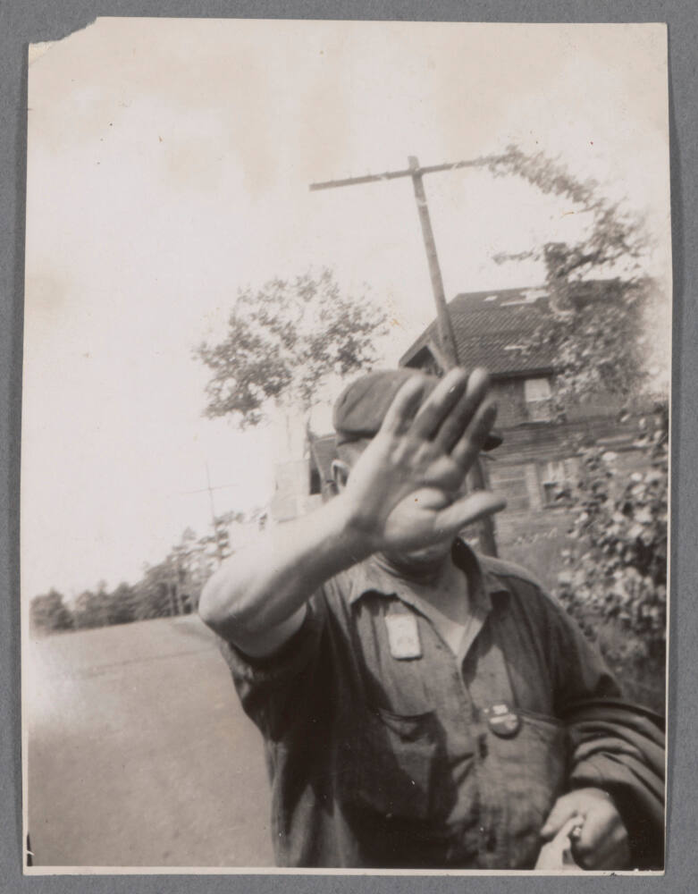 DescriptionImage of man wearing hat and collared shirt holding up hand to camera to obscure face.