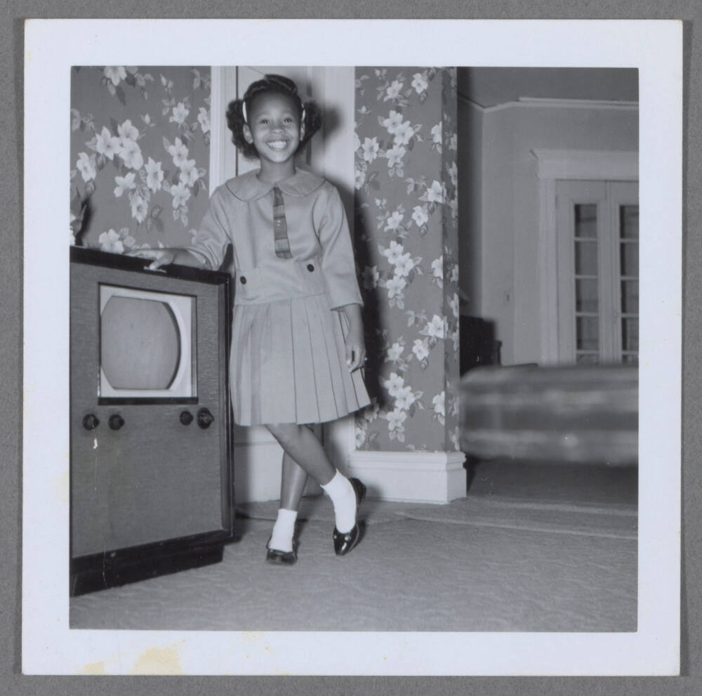 DescriptionImage of young girl with big smile wearing dress and resting arm on console television set.