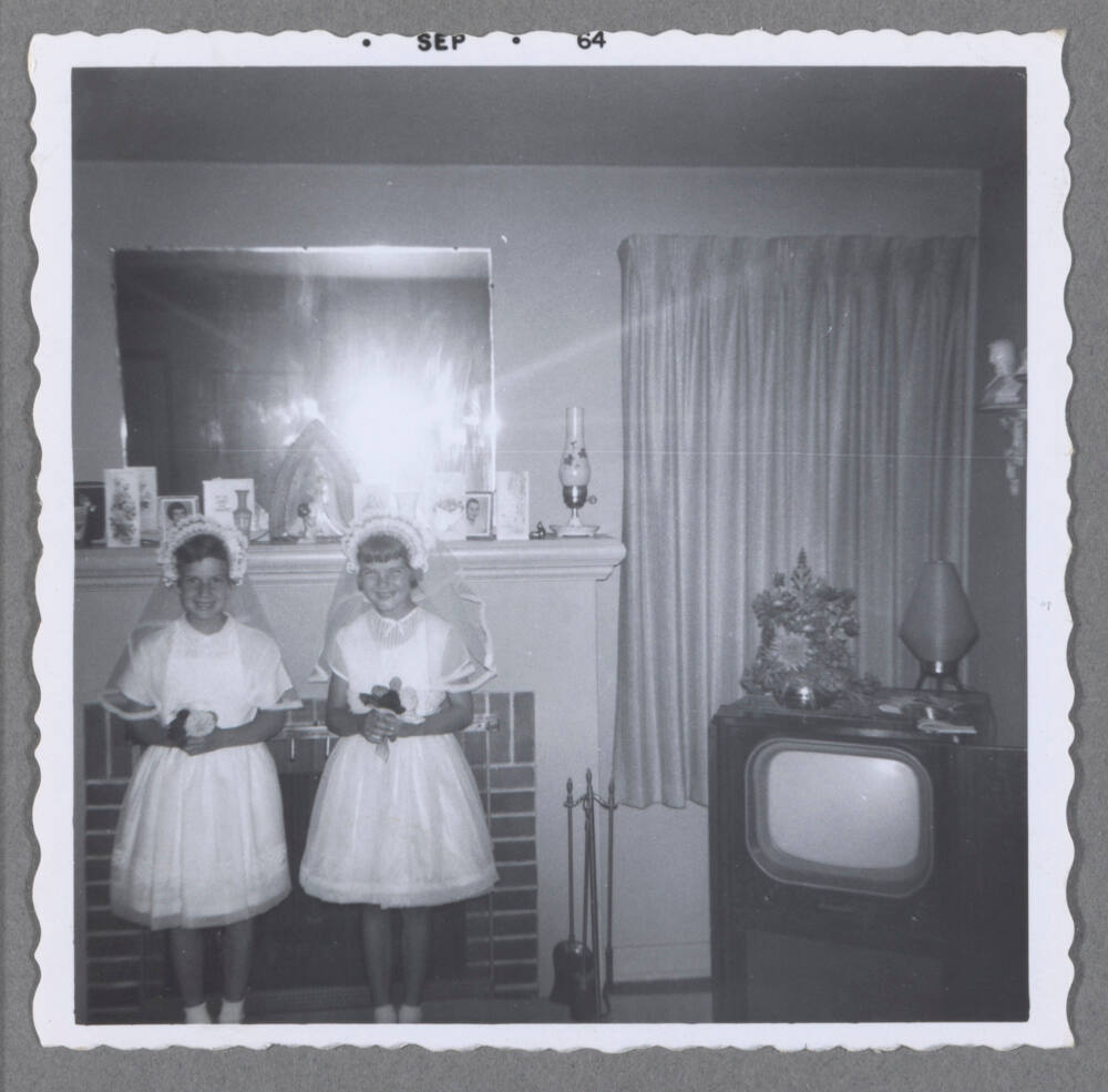 DescriptionImage of two smiling girls wearing first communion dresses and holding bouquets; standing in front of fireplace next to television set.