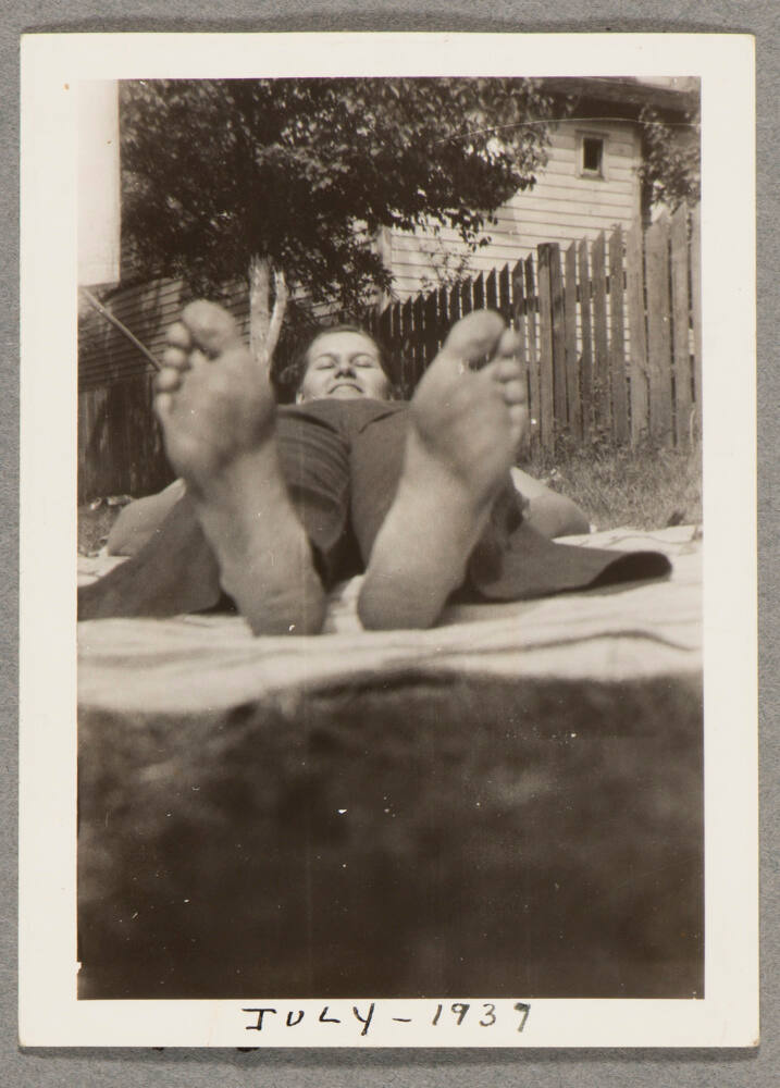 DescriptionPortrait of woman lying on her back on a blanket in the grass; her bare feet are in foreground.