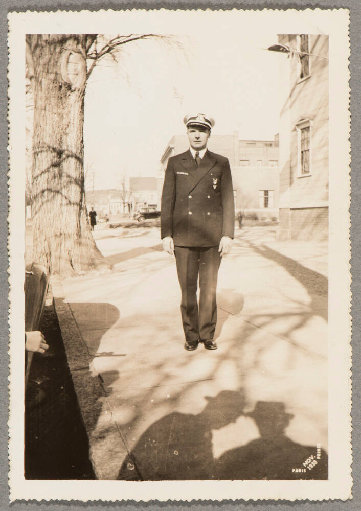 DescriptionImage of man in service uniform standing on sidewalk; shadows of two men wearing hats are visible in foreground.