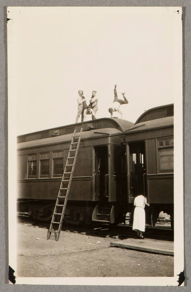 DescriptionImage of wooden ladder leading up to roof of train where four men are playing around; woman standing below near train car entrance.