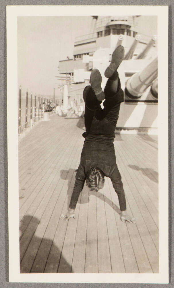 DescriptionImage of young man doing handstand on deck of ship; shadow of another man in foreground.