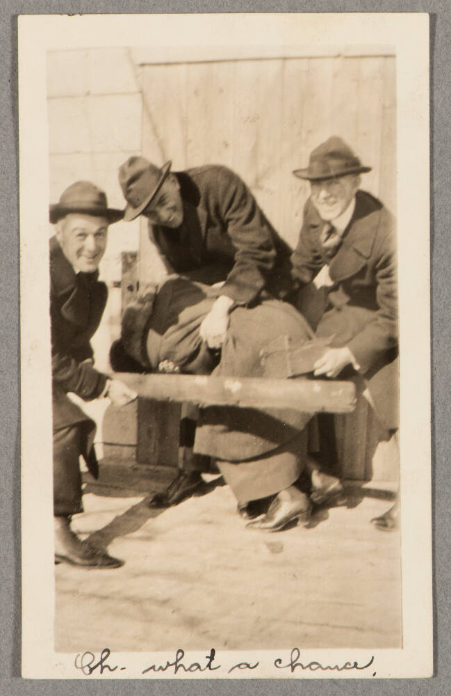 DescriptionImage of three men wearing coats pretending to spank a woman with a wooden board.