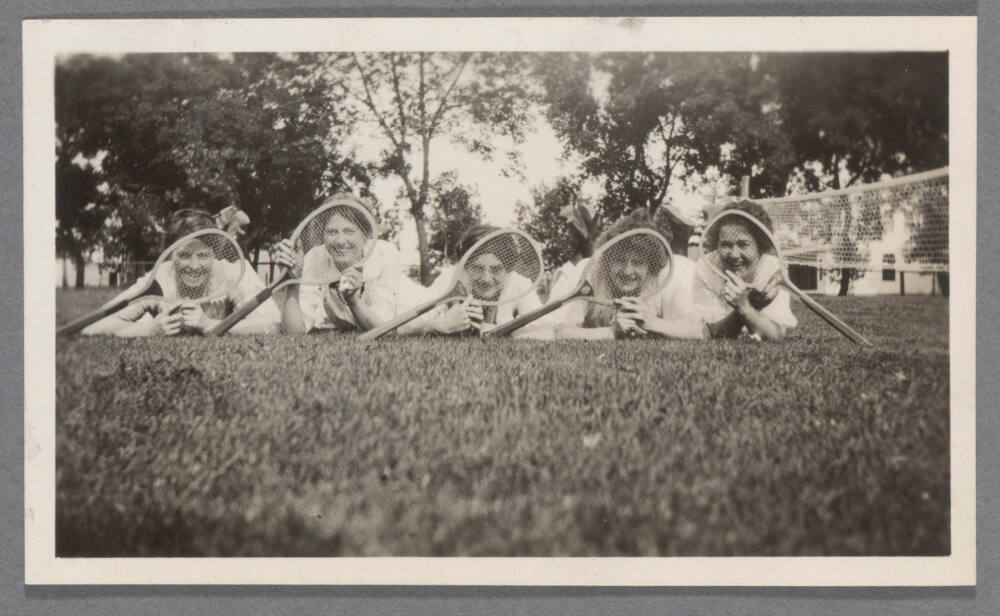 DescriptionImage of five young woman lying on grass and smiling through tennis rackets in front of their faces.